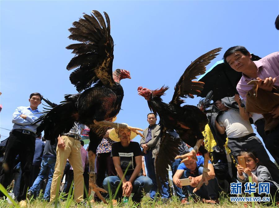 4月18日,在广西柳州市融水苗族自治县三防镇,人们在庆祝“三月三”的活动上斗鸡。 当日是农历三月初三,各地举办丰富多彩的庆祝活动。新华社发(龙涛 摄)