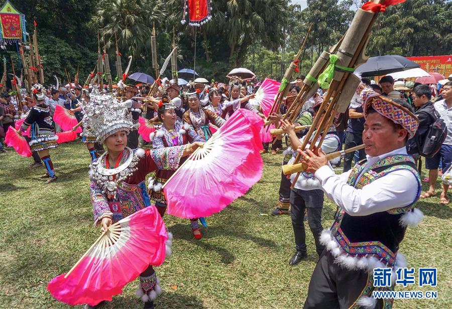 4月18日,在广西柳州市龙潭公园,人们进行芦笙踩堂庆祝“三月三”。当日是农历三月初三,各地举办丰富多彩的庆祝活动。 新华社发(赖柳生 摄)