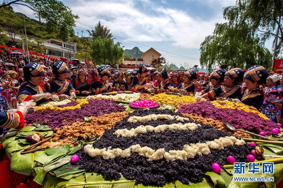 4月18日,在广西河池市凤山县三门海镇坡心村,人们品尝五色糯米饭庆祝“三月三”。 当日是农历三月初三,各地举办丰富多彩的庆祝活动。新华社发(周恩革 摄)
