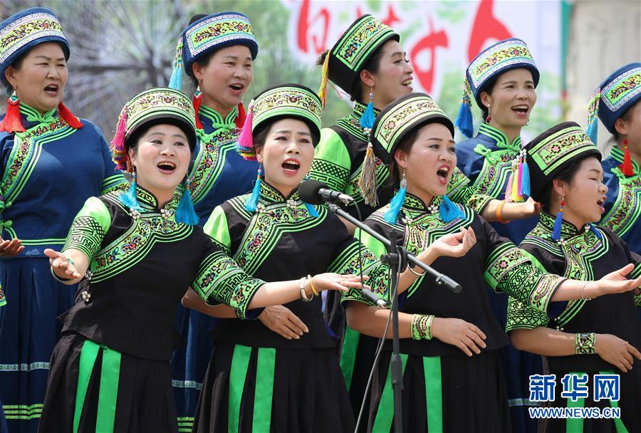 4月18日,在广西百色市隆林各族自治县举办的“三月三”歌会上,人们演唱山歌。 当日是农历三月初三,各地举办丰富多彩的庆祝活动。新华社发(林斌 摄)