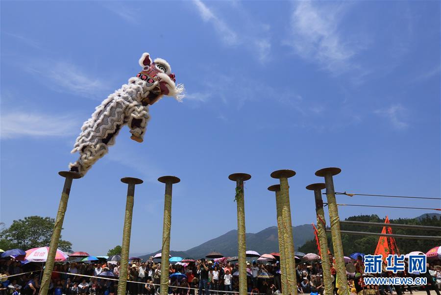 4月18日,在广西柳州市融水苗族自治县三防镇,人们观看高空舞狮表演。当日是农历三月初三,各地举办丰富多彩的庆祝活动。 新华社发(龙涛 摄)
