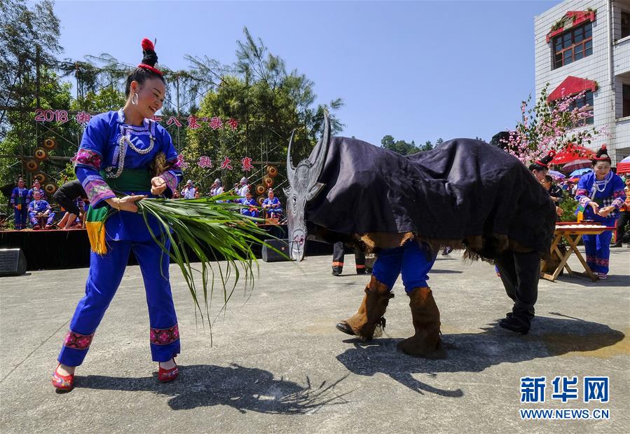 4月18日,在贵州省天柱县坌处镇,人们表演农耕场景庆祝“三月三”。当日是农历三月初三,各地举办丰富多彩的庆祝活动。 新华社发(龙胜洲 摄)