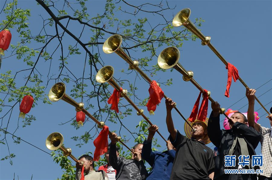 4月18日,在湖南省吉首市丹青镇锦坪村,人们在“三月三”盛会上吹奏甲马号。 当日是农历三月初三,各地举办丰富多彩的庆祝活动。新华社发(姚方 摄)