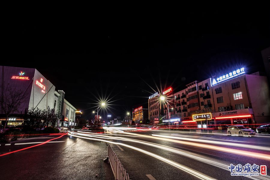 夜幕降临,雄安新区在车水马龙中焕发着别样生机,记者用慢速快门记录了这样一组灯火阑珊中的雄安新区。图为容城县奥威路夜景,这里被外界称为“央企大街”。