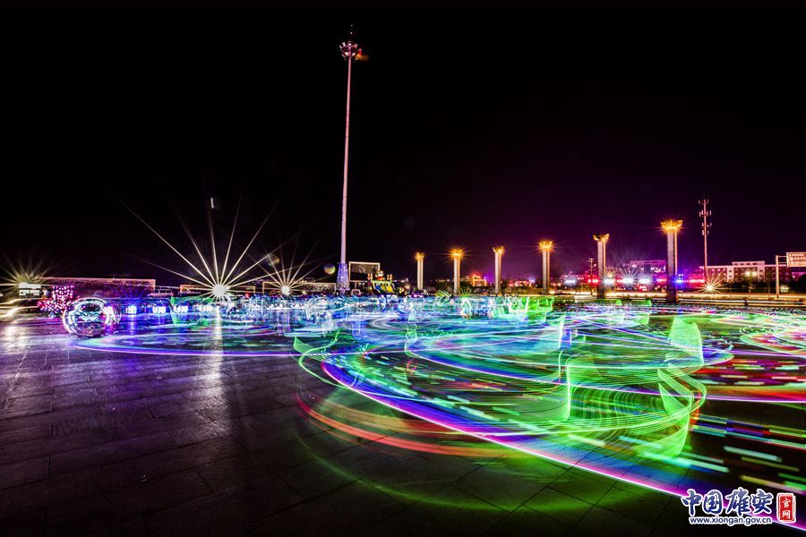 夜幕降临,雄安新区在车水马龙中焕发着别样生机,记者用慢速快门记录了这样一组灯火阑珊中的雄安新区。图为容城县奥威路夜景,这里被外界称为“央企大街”。