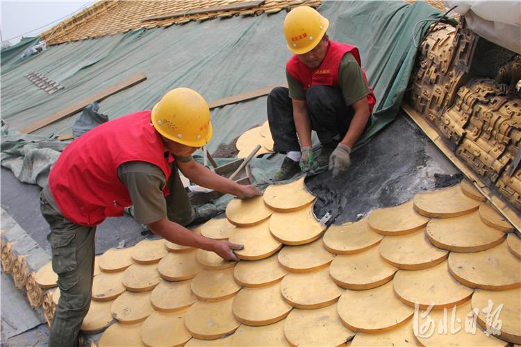 万法归一殿鎏金铜瓦安装现场。河北省古建所供图