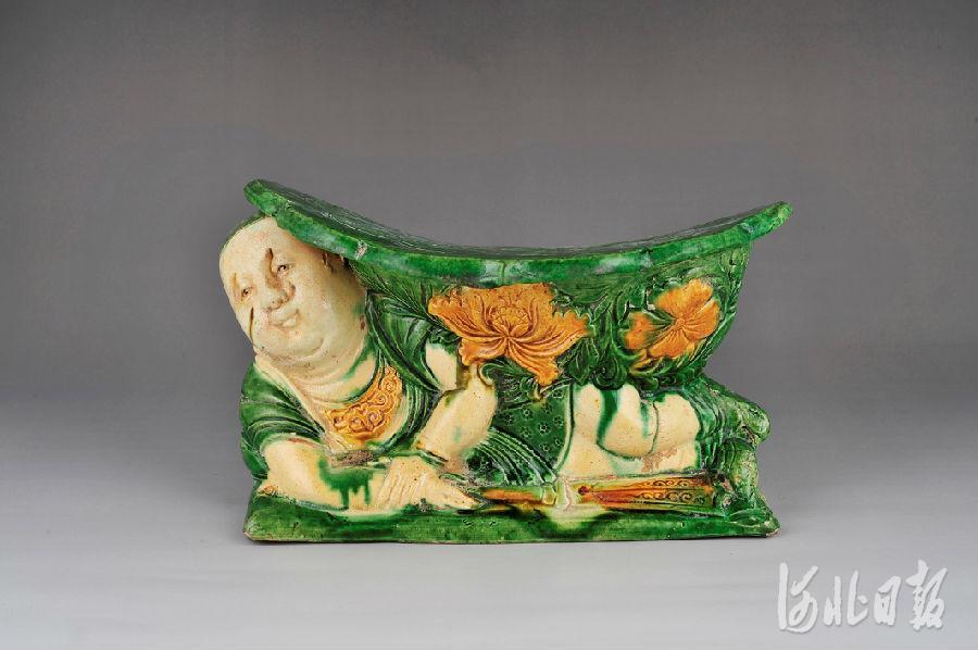 4月21日,由邢台市文物管理处等单位主办的“邢窑特展”与河北省古陶瓷学会主办的“磁州窑瓷枕精品展”,联袂在河北博物院开展。图为展览上展出的金代三彩孩儿枕。河北博物院供图