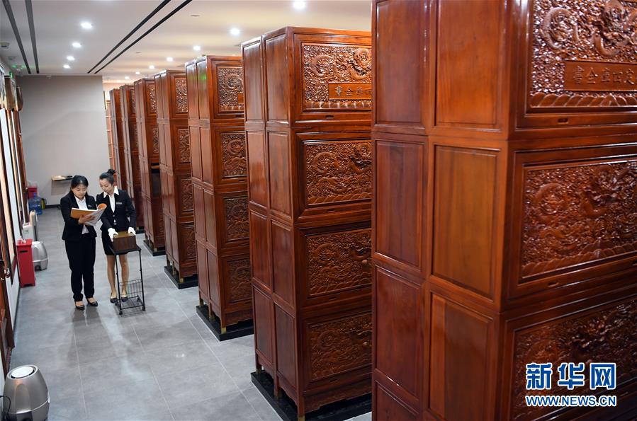 在甘肃天庆博物馆,工作人员整理影印本文渊阁《四库全书》藏书柜(4月20日摄)。新华社记者 范培珅 摄