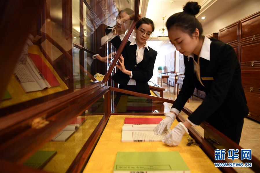 在甘肃天庆博物馆,博物馆工作人员刘妤(右)整理展柜中的影印本文渊阁《四库全书》(4月20日摄)。新华社记者 范培珅 摄