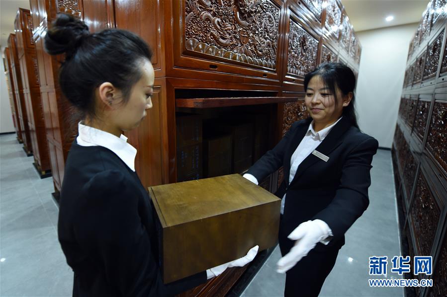 在甘肃天庆博物馆,博物馆副馆长赵婵婵(右)和工作人员刘妤整理影印本文渊阁《四库全书》藏书柜(4月20日摄)。新华社记者 范培珅 摄
