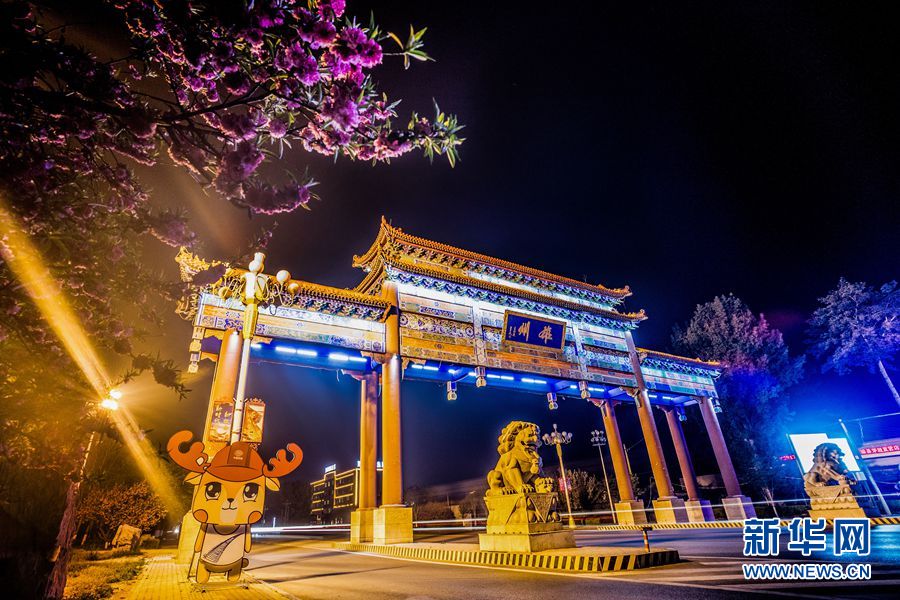夜幕中的春花与雄县牌楼相互印衬。中国雄安官网记者 王永康 摄