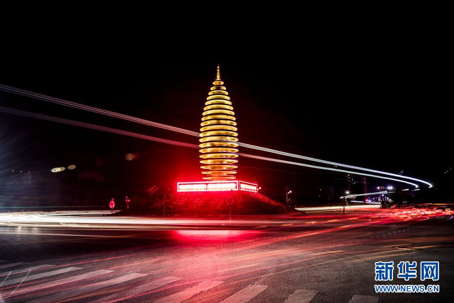 夜幕中容城县地标建筑容和塔,大车车顶灯驶向奥威路后,在夜空留下一道绚丽的光。中国雄安官网记者 王永康 摄