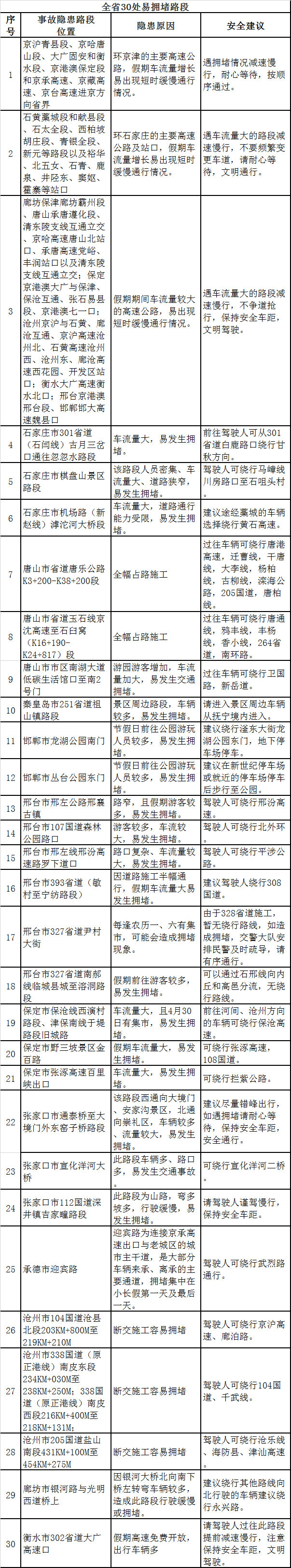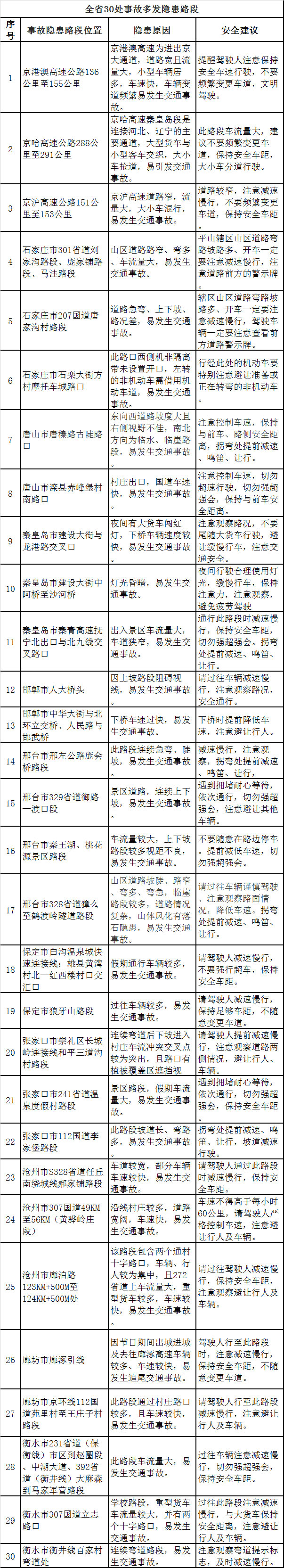 2018年“五一”假期将至,旅游旺季也随之到来,外出旅游车辆、人员增多,道路交通安全风险加大。河北省交管局根据近期全省道路交通安全形势研判,汇总了“五一”假期全省30处事故多发和30处易拥堵路段,提醒广大驾驶人合理安排出行,提前掌握路况,谨慎守法驾驶。
