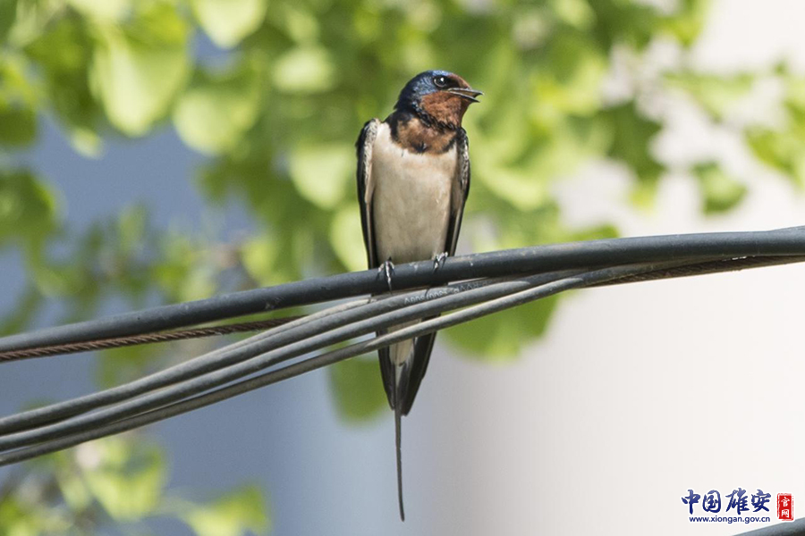 4月25日,雄安新区容城县奥威路。一只燕子在银杏树前啼叫。 王永康 摄