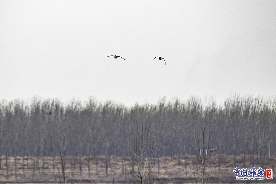 3月28日,阳春三月,雄安新区容城县南拒马河上空,两只飞鸟展翅翱翔,仿佛春天的凝视。 王永康 摄
