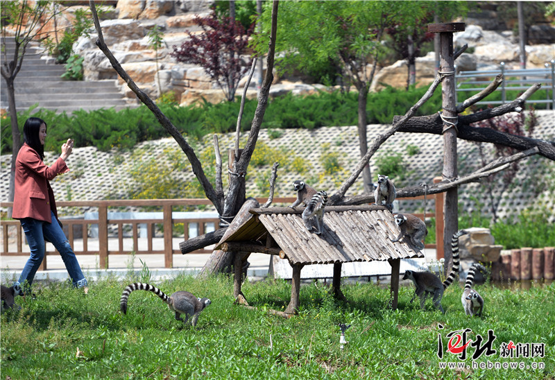 4月26日,游客正在石家庄动物园近距离观察环尾狐猴。
