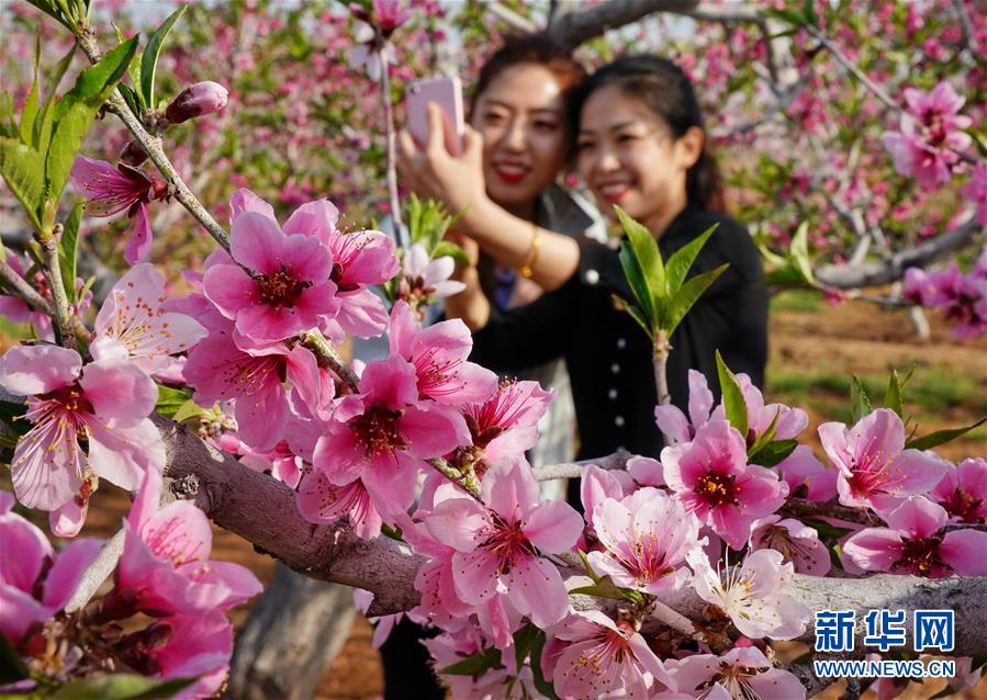 近日,河北省秦皇岛市北戴河区联峰山脚下费石庄村附近的桃花竞相绽放,吸引众多游客前来踏青赏花。