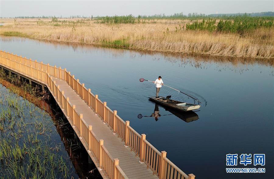 4月26日,白洋淀保洁员刘四龙在白洋淀栈道附近水面划船清理淀面垃圾。在白洋淀,每天在水上划船行程30里打捞垃圾的刘四龙,在阳光下挥汗的样子格外有神采。从小居住在白洋淀岸边的刘四龙,是安新县大王镇南六村村民,去年成为白洋淀的一名保洁员,每天早出晚归在淀里划船捡垃圾。才42岁的他虽然有时候累得腿出现浮肿,但换来的是家乡的好环境,他心里觉得值! “近两三年,白洋淀水质有所好转,原来不常见的鱼和鸟又能看到了,自己别提多高兴了!”刘四龙说。当前,白洋淀生态修复工程正紧锣密鼓进行。未来雄安,将镶嵌在蓝绿交织的生态空间之中。 新华社记者 朱旭东 摄