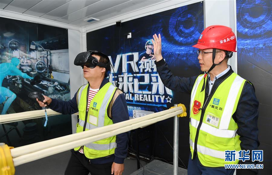 4月26日,中建三局雄安市民服务中心项目总包部安全总监谷鹏举(右)在VR体验教室进行安全教育培训。他说:“参与雄安新区建设是这辈子最热血沸腾的一次。” 40岁的谷鹏举是中建三局雄安市民服务中心项目总包部安全总监。工作18年来,谷鹏举参与过众多项目建设,但能加入雄安的建设团队,对他而言是见证了历史。雄安市民服务中心,被誉为“雄安城建第一标”。项目使用了30多项建筑新技术,在国内民用建筑史上尚属首次。最高峰时,有7000多人同时在现场施工,项目用时112天便基本完工,在如此高速下,未发生一起安全事故。安全的背后是扎实的培训。谷鹏举介绍,项目工地建立了一个集理论与实操于一体的安全培训基地,工人进入施工现场前必须在这里接受整套安全教育。新华社记者 高博 摄