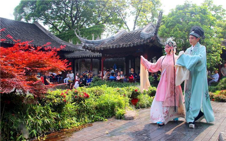 “五一”假日,有人出游赏景,有人活动嬉戏,有人依然坚守在工作岗位上……人们以各种方式乐享假期。4月29日,在江苏苏州古典园林留园,苏州昆剧院的演员在为游客表演实景版昆曲《游园惊梦》,吸引众多游人。 新华社发(王建康摄)