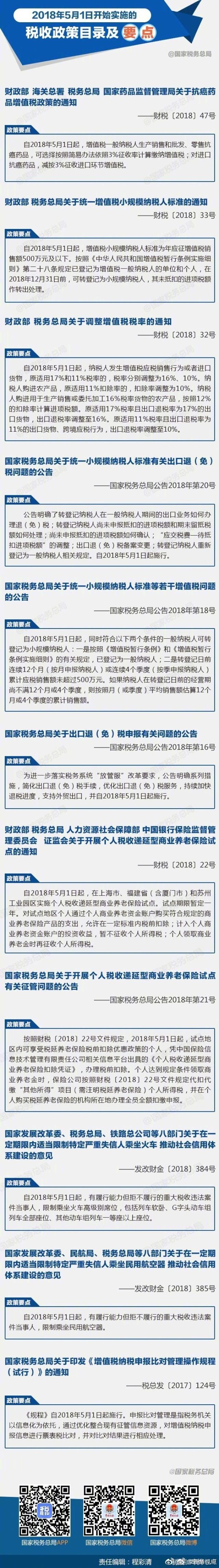 今年5月1日起,一大波税收利好向大家涌来!从将制造业等行业增值税税率从17%降至16%,将交通运输、建筑、基础电信服务等行业及农产品等货物的增值税税率从11%降至10%,统一增值税小规模纳税人标准,到取消包括抗癌药在内的28项药品进口关税,再到我国将在上海市、福建省和苏州工业园区实施个人税收递延型商业养老保险试点……这个5月,值得期待!