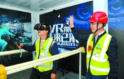 中建三局雄安市民服务中心项目总包部安全总监谷鹏举(右)日前在VR体验教室进行安全教育培训。新华社发