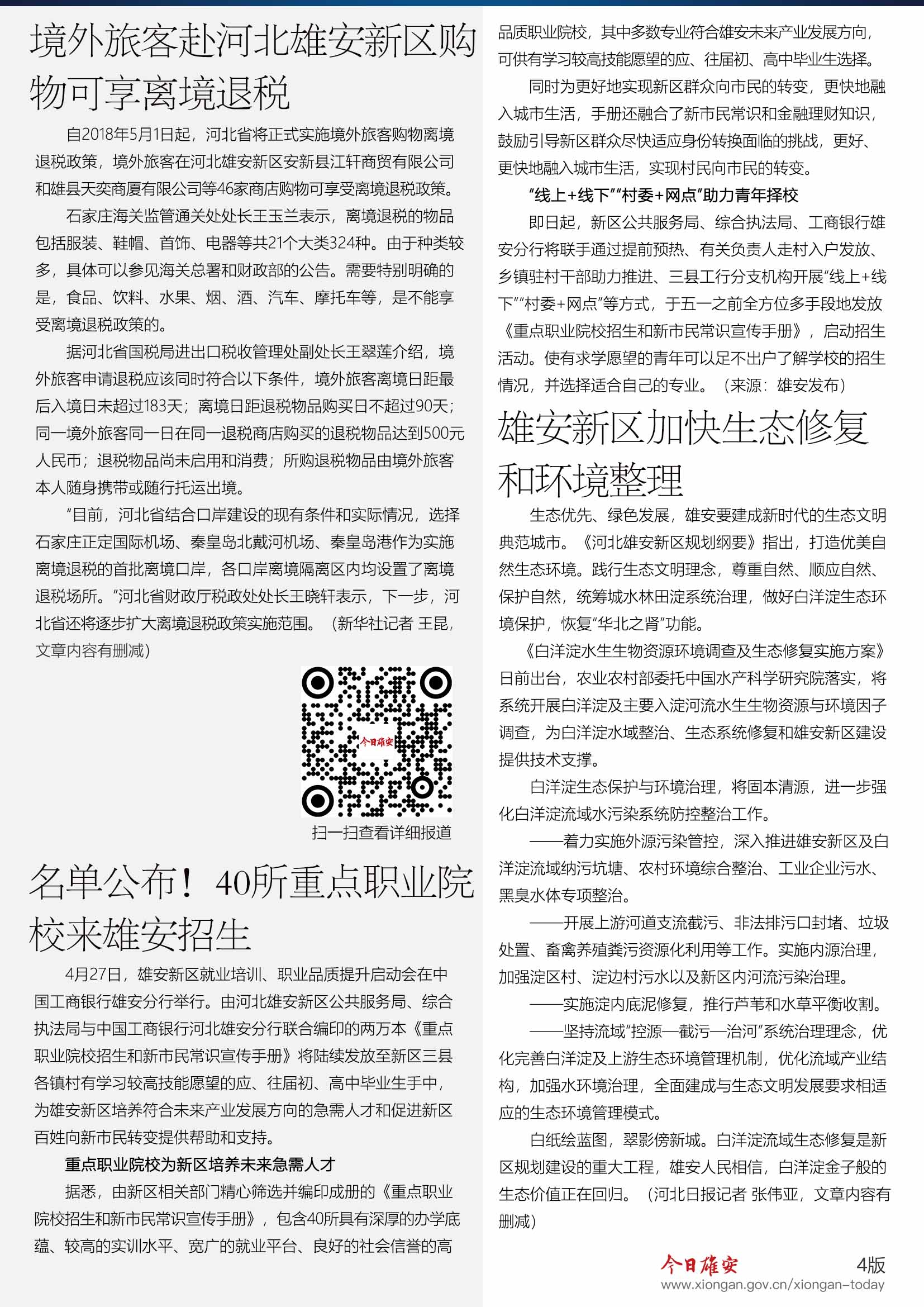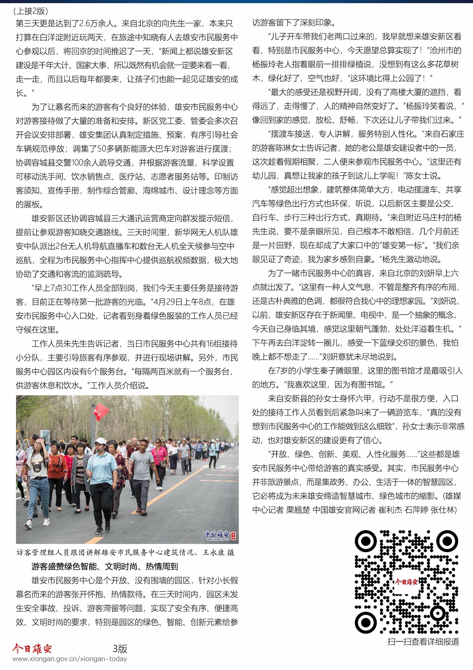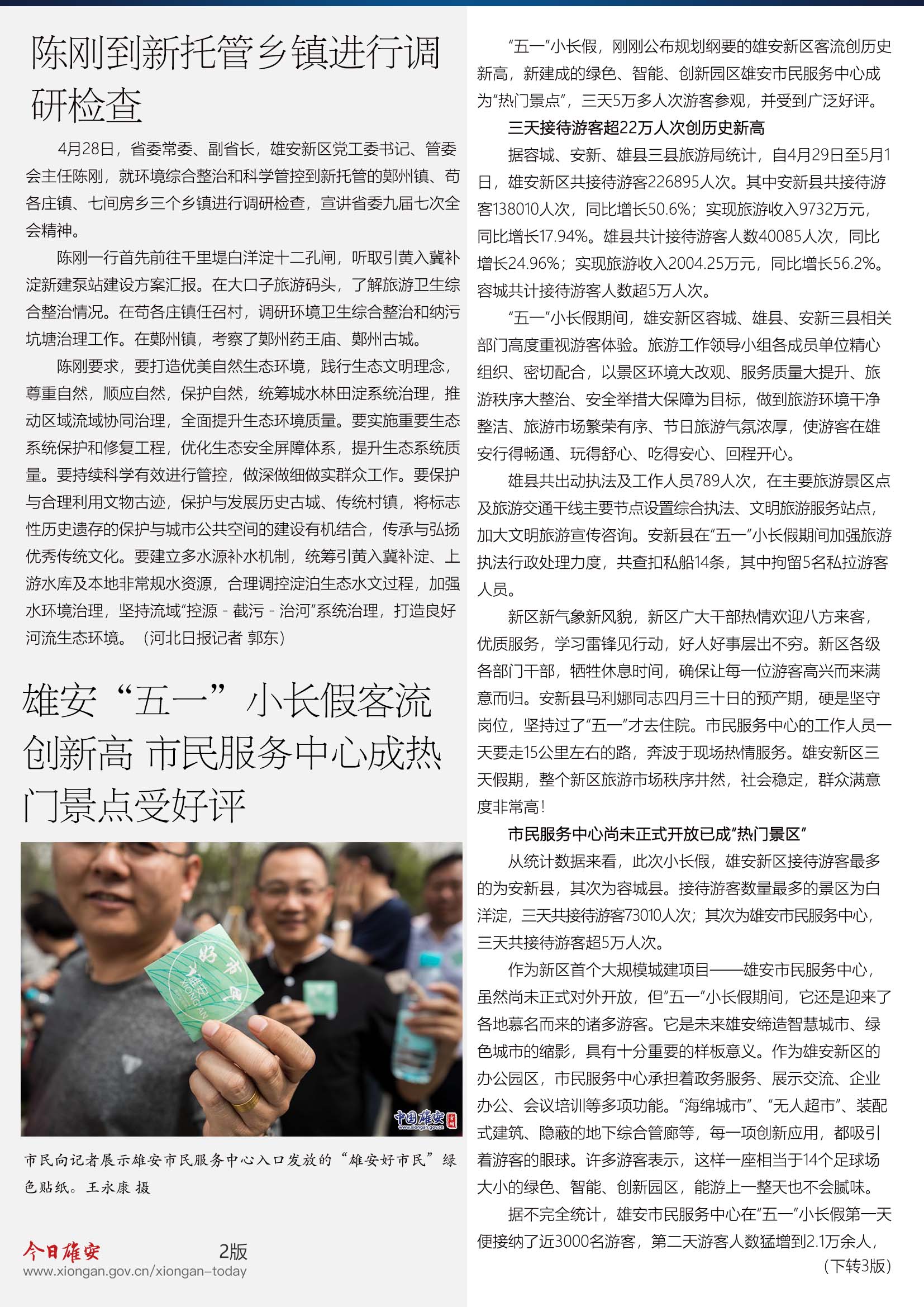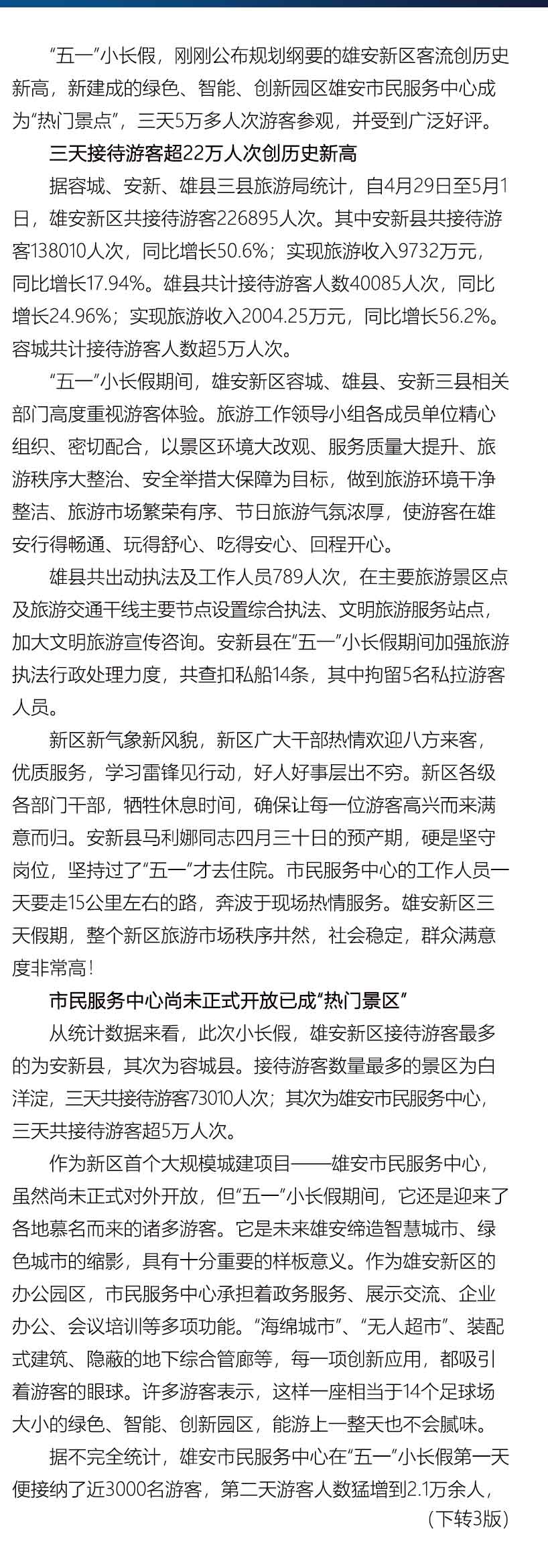 “五一”小长假,刚刚公布规划纲要的雄安新区客流创历史新高,新建成的绿色、智能、创新园区雄安市民服务中心成为“热门景点”,三天5万多人次游客参观,并受到广泛好评。