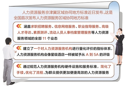 近日,京津冀人社部门和质监部门在北京召开新闻发布会,发布人力资源服务京津冀区域协同地方标准。这是全国首次发布人力资源服务区域协同地方标准。该标准将于8月1日起正式实施。届时,三地人力资源服务将更加规范,求职者在三地都能享受同样标准的人力资源服务。