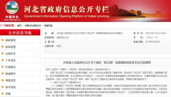 为进一步规范“防尘网”使用,消除“防尘网”对高铁运行造成的安全隐患,日前,河北省政府办公厅印发《关于规范“防尘网”设置确保高铁安全运行的通知》提出,对全省境内已开通运营的京沪、京广、津秦、石太、津霸、石济客专等6条高铁沿线两侧500米范围内使用的“防尘网”进行全面整治。