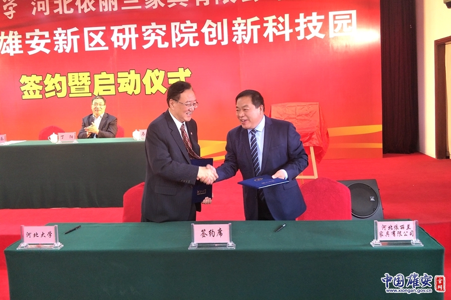 活动上,河北大学校长康乐与河北依丽兰家具有限公司董事长马永雷签约,安新县县长丁阳、河北大学校长康乐、河北依丽兰家具有限公司董事长马永雷共同为河北大学雄安新区研究院创新科技园揭牌,河北省区域经济研究院团队、雄安新区公共服务体系与教育发展规划项目研究团队、“十三五”科技重大专项水专项技术研究团队、石墨烯纳米光电器件研发团队作为首批入驻项目代表进行签约。