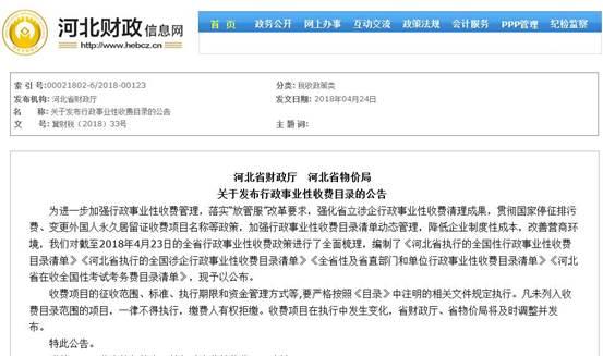 据了解,此次发布的行政事业性收费目录清单,列出了自2018年4月24日起河北省执行的行政事业性收费项目。如行政事业性收费政策有变化,河北省财政厅、省物价局将及时调整并发布。