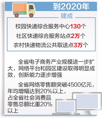 到2020年,快递物流节点布局更加优化,基础设施数字化水平显著提升,电商物流末端服务能力明显提高,智慧快递物流服务体系基本建立,电子商务与快递物流更加高效协同,全省快递业务量达到25亿件,年均增幅30%以上。建成校园快递综合服务中心130个,社区快递综合服务站点2万个,农村快递物流公共取送点3万个。