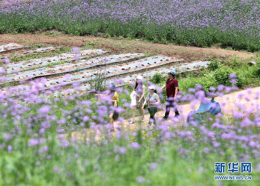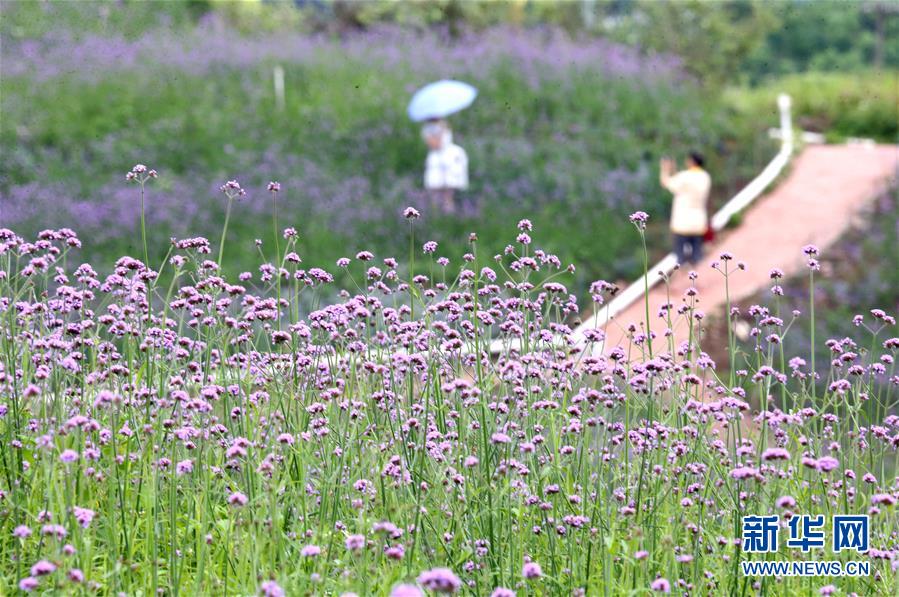 5月5日,游客漫步在广西南宁市良庆区那马镇坛良村坛板坡花间小道上。时下,广西南宁市良庆区那马镇坛良村坛板坡100多亩马鞭草和非洲雏菊竞相盛放,田园风光吸引了不少游客前来观赏。 新华社记者 周华 摄