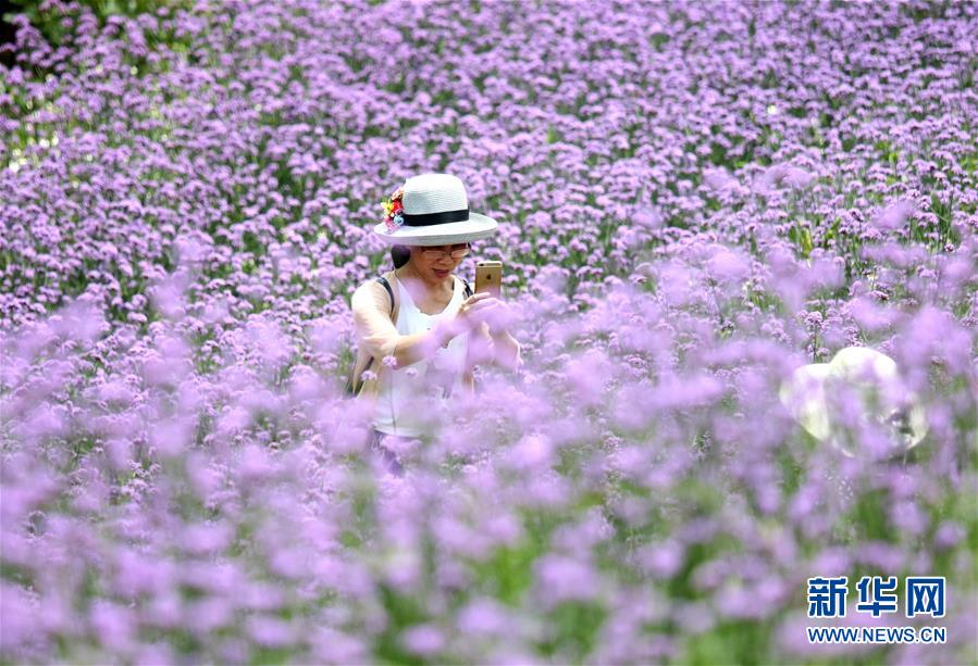 5月5日,游客在广西南宁市良庆区那马镇坛良村坛板坡花海里拍摄。时下,广西南宁市良庆区那马镇坛良村坛板坡100多亩马鞭草和非洲雏菊竞相盛放,田园风光吸引了不少游客前来观赏。 新华社记者 周华 摄