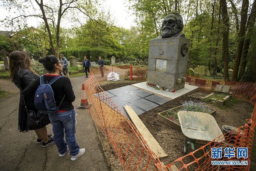 历史长河奔流不息,真理之光穿越时空。1818年5月5日,德国小城特里尔,一代伟人马克思诞生。200年后,世界东方。高擎马克思主义的精神火炬,在习近平新时代中国特色社会主义思想指引下,中国共产党正领导亿万人民书写人类发展史上新的奇迹。这是2018年5月3日,在英国伦敦北部海格特公墓,人们来到正在进行维修的马克思墓前参观。 新华社发(蒂姆·爱尔兰摄)