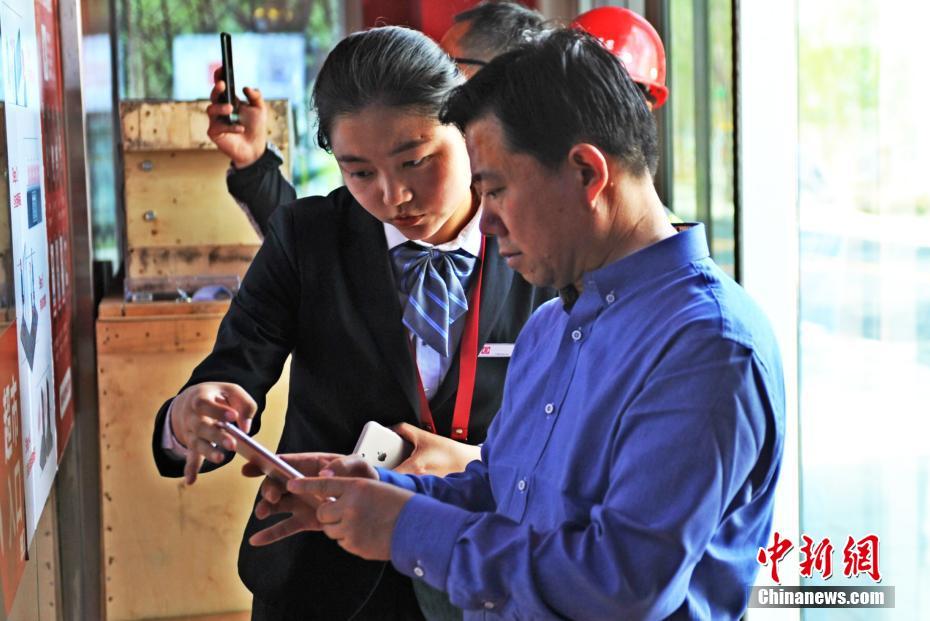 图为商店工作人员为顾客讲解APP下载流程和购物流程。中新社记者 韩冰 摄