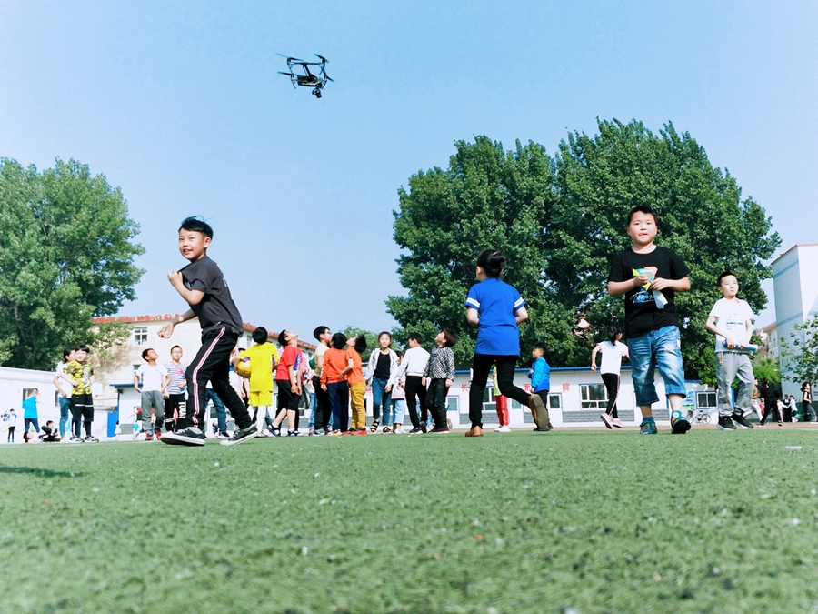 安新县第二小学学生观看无人机拍摄。图片由安新县科技局提供