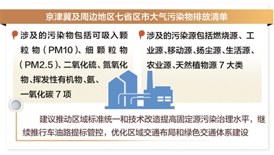 国家大气污染防治攻关联合中心副主任、中国环境科学研究院首席科学家柴发合介绍,该研究项目首次建立了京津冀及周边地区七省区市(京津冀晋蒙鲁豫)大气污染物排放清单,涉及的污染物包括可吸入颗粒物(PM10)、细颗粒物(PM2.5)、二氧化硫、氮氧化物、挥发性有机物、氨、一氧化碳7项,涉及的污染源包括燃烧源、工业源、移动源、扬尘源、生活源、农业源、天然植物源7大类。