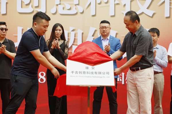 容城县副县长谢宏伟(右)与雄安千吉创意科技有限公司董事长张龙飞(左)共同为雄安千吉创意科技有限公司成立揭牌。记者张仕林 摄