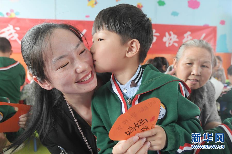 5月10日,在湖北省襄阳市一家幼儿园举办的母亲节主题活动中,一名小朋友将自己制作的贺卡献给妈妈。 新华社发(安富斌 摄)