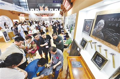 5月12日,河北展区“文创大集”内人头攒动,“郭氏铁板浮雕”传承人郭海博先生的现场展示吸引了众多参观者。记者赵海江摄