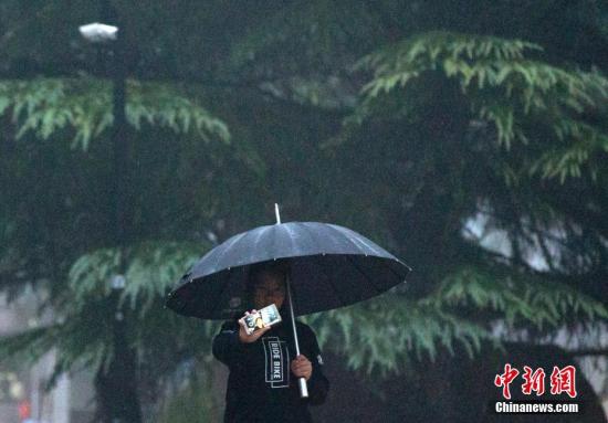 资料图:市民在雨中自拍。 中新社记者 刘关关 摄