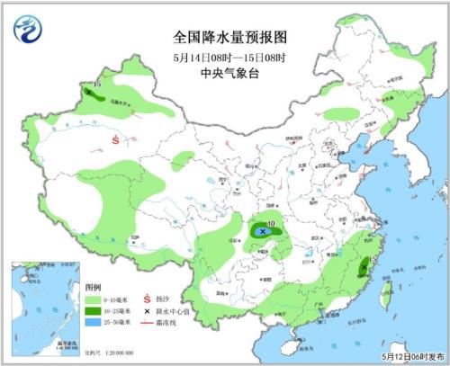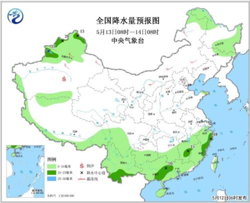 图1 全国降水量预报图(5月12日08时-13日08时)