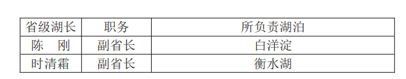 按照《河北省实行河长制工作方案》,全省35个湖泊已明确了河长,根据中央关于实施湖长制的原则和要求,对有湖泊行政区域设立的原各级总河长名称统一调整为总河湖长,在原湖泊设立的河长名称统一调整为湖长,在河长制体系中健全省市县乡四级湖长体系。在白洋淀、衡水湖设立的省级河长即是省级湖长。