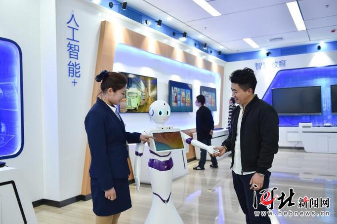 近日,位于中关村互联网文化创意产业园(廊坊园)的科大讯飞河北科技有限公司人工智能设备展厅,参观者(右一)正与人工智能机器人交流。产业园将通过智慧园区平台系统运营,以互联网、文化、科技、金融为主体,最终打造国家一流的互联网文化产业示范园区、国家级文化和科技融合示范基地。 记者 霍艳恩摄