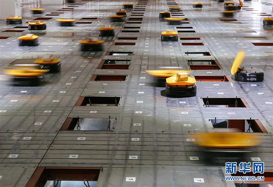 在义乌申通公司,机器人运载包裹进行分拣(2017年5月3日摄)。 新华社记者 张铖 摄