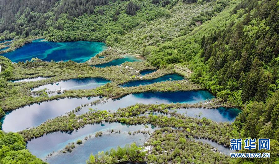 这是九寨沟景区的树正群海景点(5月17日无人机拍摄)。 新华社记者薛玉斌 摄