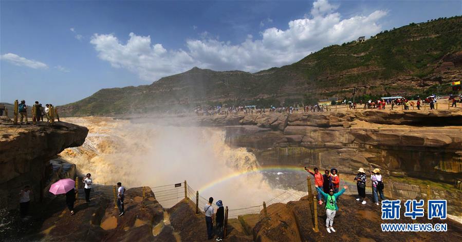 5月18日,游客在陕西宜川县黄河壶口瀑布景区游览。近日,受黄河干流降雨影响,壶口瀑布水量增加,呈现“大河流金”景观,引来众多游客参观。 新华社发(赵洁 摄)