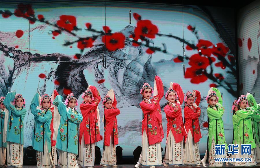 5月21日,小学组小演员表演汉剧《二度梅选段》。当日,武汉中小学戏曲进校园展演在武汉市洪山文体中心举行,按照幼儿园、小学和中学等组别,集中展示了50余个优秀戏曲节目,传承中国传统文化。新华社发(赵军 摄)