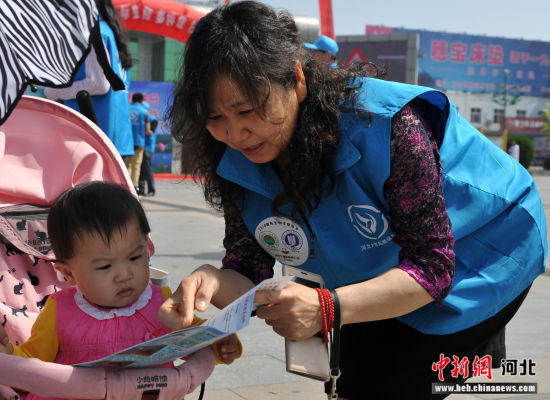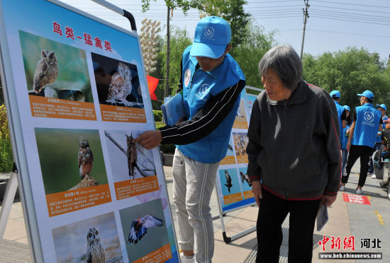 图为河北大学的志愿者们通过展板为雄安新区民众讲解生物多样性知识。 韩冰 摄